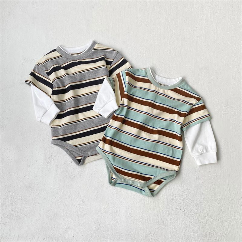 2025秋新作 ベビー服 男女兼用 ストライプ柄 フェイクレイヤード 長袖 ロンパース 子供服 可愛い