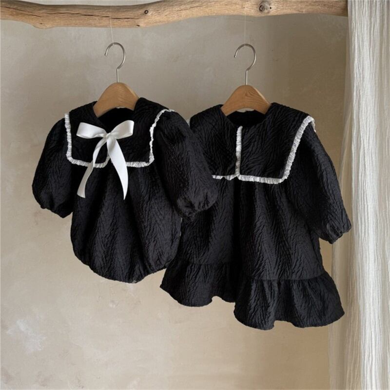 2025秋新作 姉妹コーデ 双子コーデ 女の子 大きな襟 長袖 ワンピース 可愛い おしゃれ 子供服 リボン取り外し可能 2色